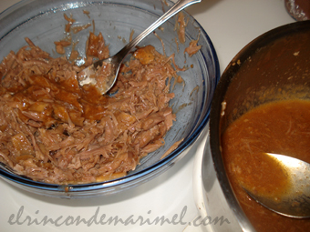 Una vez calientes desmigamos las carrilleras en un bol con ayuda de un tenedor (foto 2ª). Le incorporamos las setas picadas. Reducimos un poco la salsa, y le añadimos un par de cucharadas a las carrileras desmigadas para que queden bien jugosas (foto 3ª). Reservamos el relleno caliente. |