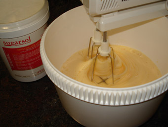 Montamos los huevos con el Sugarsol (foto 1ª), hasta que éstos queden esponjosos. Incorporamos la leche, y el aceite poco a poco en forma de hilo, sin dejar de batir.