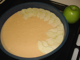 Pelamos las manzanas, las descorazonamos, las cortamos por la mitad y hacemos rodajas finas. Ponemos por encima de la masa las láminas de manzana, cubriendo toda la superficie (foto 2ª). Espolvoreamos por encima con Sugarsol ó azúcar glacé.