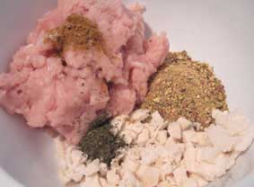 Colocamos el pollo, el pan, los pistachos, el huevo y las especies en un bol grande (foto 1ª) y lo mezclamos bien.