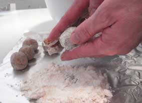 Con ayuda de las manos, formamos bolitas con cucharadas de masa y las rebozamos con la harina, retirándole la sobrante.(foto 2ª)