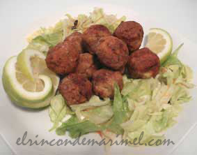 Calentamos en un cazo abundante aceite y freímos las bolas por tanda a fuego medio, dándoles vueltas hasta que se doren. Las retiramos sobre papel absorbente, para quitarles el exceso de grasa. Las servimos acompañadas de unas rodajas de limón y una ensalada verde. (foto 3ª)