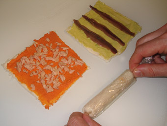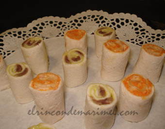NOTA: también los puedes hacer de queso de untar con anchoas; o mantequilla, eneldo y salmón ahumado; o puré ligero de pera con paté; o lo que quiera tu imaginación,