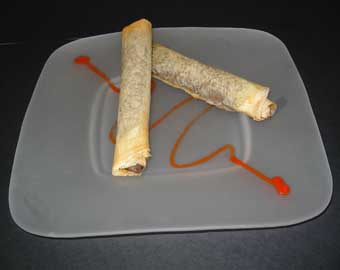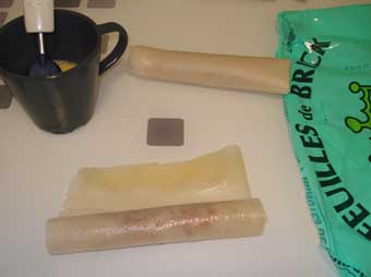 Cuadramos las obleas de pasta brick, recortando los laterales. Ponemos un poco de relleno en el lado inferior de la oblea y enrollamos formando un cilindro (foto 2ª). Pintamos con huevo batido el final, para que no se despegue. Ponemos los canutillos sobre papel