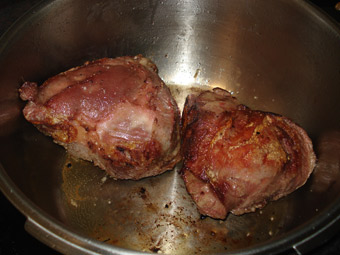 Dejamos enfriar, retiramos las carrilleras, y una vez frías las cortamos en escalopes de 1,5 cm. de grosor.