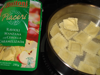 Aunque en Bélgica nos sirvieron el plato acompañado de un cuenco de patatas fritas (las típicas frites), en este caso nosotros lo hemos acompañado de unos ricos raviolis de manzana y cebolla caramelizada, que creo que le van muy bien. Esta vez, los hemos comprado, aunque si tenéis tiempo animaros a elaborarlos.