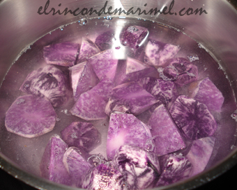 NOTA: a las patatas duquesa, se les pinta con huevo batido antes de introducir en el horno, para que la capa exterior quede más crujiente, pero en nuestro caso es mejor no hacerlo porque apagaría el color violeta que le queremos dar.