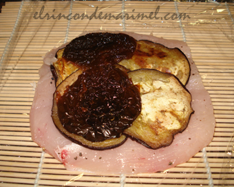 Para elaborar los involtini, aplastamos los filetes con una espalmadera o la hoja de un cuchillo grande. Salpimentamos. Cubrimos una esterilla de las de sushi con papel film (si no tenemos esterilla, utilizamos un trozo de papel de hornear). Colocamos encima los filetes. Encima de cada uno, unas rodajas de berenjena, sin llegar a cubrir toda la supeficie, encima de estas el tomate deshidratado (foto 2ª) y por último unas láminas finas de mozzarella.