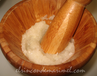 Para la masa del kibbeh , picamos con el cuchillo una de las cebollas y la colocamos en un mortero. Añadimos sal, pimienta y un poco de mantequilla fría. Con paciencia, vamos machacando hasta conseguir una pasta o puré (foto 2ª) . Reservamos. En el mismo mortero machacamos los trozos de cordero, hasta convertirla igualmente en una pasta.