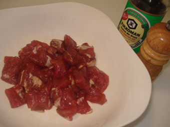 Cortamos el solomillo en dados grandes y lo ponemos en un bol. Lo condimentamos con pimienta recién molida, sal , un pizca de nuez moscada, un chorrito de salsa de soja y otro de aceite de oliva. Lo mezclamos con las manos para que penetre bien el adobo en la carne. Dejamos macerar de media, a una hora, para que la carne coja bien los sabores (foto 1ª).