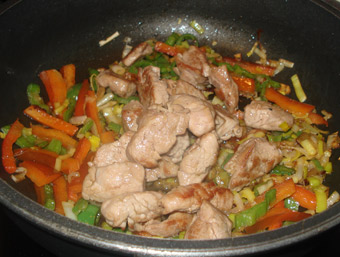 En esa misma sartén, introducimos en primer lugar los ajos cortados en láminas. Cuando empiecen a coger color, añadimos las cebolletas junto con el puerro, y los dos tipos de pimientos, cortados en tiras. Dejamos que se pochen, pero sin dejar que se ablanden demasiado. Una vez que la verdura esté "al dente", añadimos los dados de solomillo previamente dorados (foto 2ª), el mango cortado en cuadraditos, un chorrito de salsa de soja y otro de jugo de carne. Yo lo reemplazo, disolviendo una cucharada de jugo Bovril, en un poco de agua caliente.