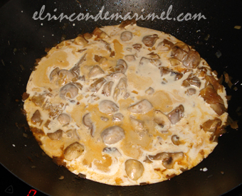 En la misma sartén, bajamos el fuego (a medio), añadimos un poco más de mantequilla y pochamos en ella las chalotas con el puerro picado. Cuando la verdura este tierna incorporamos los champiñones cortados en cuartos (foto 2ª) y la cayena (si nos gusta darle un toque picante). Salpimentamos. Dejamos que se nos hagan unos 3 o 4 minutos, añadimos el pimentón, le damos unas vueltas y añadimos el vodka (foto 3ª). Dejamos que este reduzca a seco, e incorporamos la nata, el vasito de jugo de carne, una cucharadita de mostaza y unas gotitas de limón (foto 4ª). Mezclamos y dejamos cocinar hasta que se nos haga una salsa espesita. |
