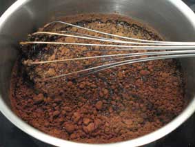 Ponemos a cocer la leche con el azúcar. Cuando comience a calentarse, añadimos el cacao y la nata. Removemos (foto 1ª), y dejamos que hierva. Cuando llegue a ebullición retiramos del fuego e incorporamos