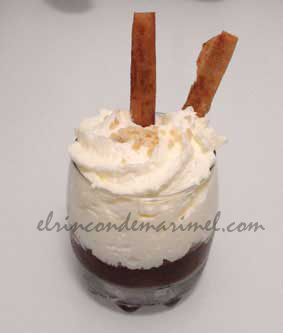En el momento de servir, sacamos los vasitos de la nevera, los espolvoreamos de almendras " granillo" y le ponemos un par de barquillos de los que hemos hecho.(foto 3ª). |