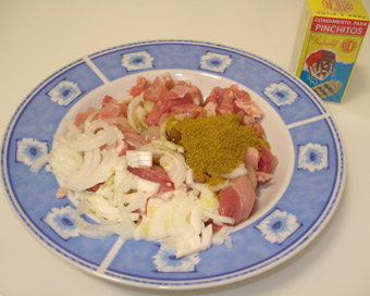 Con unas horas de antelación, quitamos la piel a los muslos, les deshuesamos y los cortamos en tiras finas, las ponemos en un bol, y las condimentamos con la cebolleta picada, sal, pimienta recién molida, un chorro de aceite de oliva y especias para pinchitos (foto 1º) ( lo venden en grandes superficies o en centros especializados. Si no la encontramos lo podemos aderezar, con comino, cúrcuma, orégano...etc.) . Mezclamos y dejamos macerar durante unas horas para que tome el aliño.
