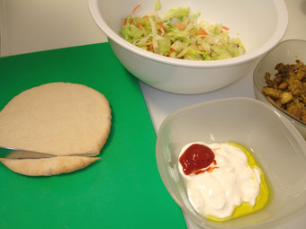 Los panes de pita los hacemos en el horno o mejor en una tostadora. Para ello los humedecemos previamente mojándolos un poco con agua. Los ponemos en la tostadora procurando que no se nos tuesten en exceso, porque si no se nos romperían al rellenarlos. Una vez hechos, les cortamos un trozo en una esquina, como en la foto (foto 2ª), y con ayuda de una cuchara pequeña despegamos las paredes para que luego podamos rellenar su interior.