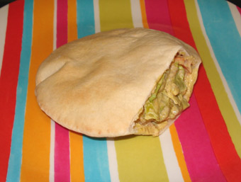A la hora de comer mezclamos la lechuga ( bien escurrida ) en un bol grande con el tomate, la pechuga y la salsa y rellenamos los panes de pita con ayuda de una cuchara (foto 3ª). A COMER.