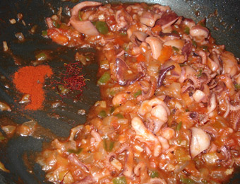 Volvemos a calentar el aceite, le añadimos la cebolleta y los pimientos cortados en cuadraditos pequeños. Cuando estén bien pochados, incorporamos el ajo picado, rehogamos y ponemos el tomate rallado y lo dejamos que evapore su agua. Cuando esté como una compota, añadimos la sepia salteada anteriormente.
