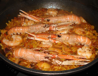 NOTA: yo particularmente prefiero pelar todo el marisco, utilizar las cáscaras y cabezas para el caldo y añadir sólo a la fideuá la carne de éstos, dejando algunas cigalas enteras, para decorar el plato.