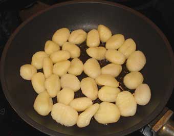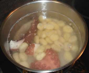 En primer lugar, ponemos en una cazuela grande abundante agua con un chorrito de aceite. Mejor si pudiéramos utilizar el agua de cocción del pulpo. Cuando empiece a hervir añadimos un puñado de sal y echamos los ñoquis y las patas de pulpo. Como en está ocasión vamos a utilizar pulpo ya cocido, añadiremos éste junto a los ñoquis. De esta forma conseguiremos dos cosas, calentar el pulpo y dar sabor al agua de cocción (foto 1ª). Con un minuto hirviendo, ya basta, pero tendremos en cuenta el tiempo de cocción que nos marque el fabricante. Cuando estén " al dente" sacamos los ñoquis, y los escurrimos. En la misma cazuela de la cocción ponemos un chorro de aceite de oliva y rehogamos unos segundos los ñoquis cocidos para que se impregnen del aceite de oliva (foto 2ª). El aceite no ha de estar muy caliente, para que no se nos pasen los ñoquis.