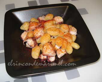 NOTA: Si quieres cocer el pulpo, unos consejos: congélalo antes, para romperle la textura y ablandarlo. Cuécelo en abundante agua hirviendo. Cuando el agua hierva, se sumerge el pulpo durante unos segundos, se saca, y se vuelve a introducir en la olla. Se repite la operación tres o cuatro veces ("asustar el pulpo"), luego se añade sal gruesa y ya se deja hervir de veinte a treinta minutos dependiendo del tamaño. Podemos comprobar si está cocido, introduciéndole una brocheta. Se apaga el fuego y se deja otros veinte minutos. Es aconsejable dejarlo enfriar dentro de la olla, en su propio agua, hasta que se vaya al fondo. Se sirve en plato de madera, ya que éstos retienen mejor su calor y se corta con tijeras.