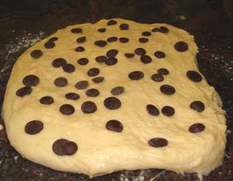 Amasamos de nuevo para desgasificar, sobre una mesa enharinada. Aplanamos la masa y le ponemos por encima las pepitas de chocolate (foto 2ª). Enrollamos, hacemos una bola y la metemos en un recipiente, al que le colocamos un suplemento que hacemos doblando un papel de hornear. Con un cuchillo cortamos en la superficie una figura triangular. Tapamos y dejamos fermentar hasta que doble de nuevo su volumen. La bola nos ocupará el molde bajo (foto 3ª), y al levar, se expandirá hacia arriba lo que le dará la forma de cúpula del panettone.