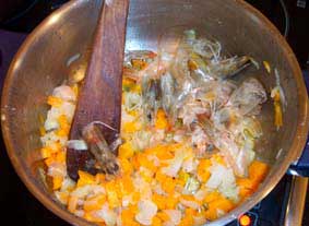 de los langostinos, con la cebolla y las zanahorias picadas (foto 1ª) Salpimentamos. Dejamos