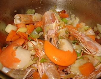 Para mojar el arroz, elaboraremos una salsa americana ligera. Para ello, ponemos a pochar con un poco de aceite de oliva, la media cebolla cortada en juliana junto con la zanahoria en rodajas. Cuando estén casi cocinadas agregamos el puerro también cortado en rodajas. Cuando estén todas las hortalizas bien pochadas, añadimos el coral de las vieiras y las cabezas de los langostinos (foto 1ª), sofreímos, ponemos una cucharilla de pimentón dulce, damos unas vueltas y flameamos con el brandy. Después mojamos hasta cubrir un par de dedos por encima, con fumet de pescado o con agua, y dejamos hervir a fuego suave, desespumándolo, unos 30 minutos. Unos 10 minutos antes de terminar su cocción, introducimos la cáscara de naranja (después de lavar bien su piel, sacamos con ayuda de un pelador, unas tiras sin lo blanco). Pasados los 30 minutos, retiramos la cáscara, que habrá dejado su perfume, trituramos, tamizamos por un colador fino y rectificamos de sazonamiento.