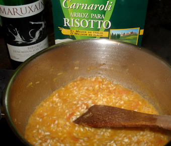 Para elaborar el arroz, primero sofreímos los ajos y las cebolletas bien picados. Cuando estén pochados sin que cojan color, incorporamos el tomate pelado, despepitado y picado en daditos pequeños. Cuando estén las hortalizas bien cocinadas, añadimos el arroz, lo rehogamos un par de minutos y vertemos el vino blanco (foto 2ª). Una vez que el vino se haya evaporado, iremos mojando con un poco de la salsa a medida que esta se vaya reduciendo. Haremos esta operación, removiendo de vez en cuando el arroz, hasta que esté hecho. El tiempo de cocción de este tipo de arroz es aproximadamente de unos 16 a 18 minutos. |