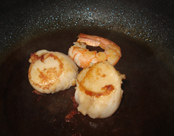 Cuando queden 4 minutos para terminar su cocción, añadimos los langostinos cortados en trozos gruesos (foto 3ª). Al final, trabamos el arroz con un buen chorro de aceite de oliva, como si se tratara de “mantecar” un risotto. Mientras dejamos reposar el arroz 2 minutos, marcamos los langostinos reservados y los cuerpos de las vieiras, (previamente sazonados y bañados en aceite) en la plancha a fuego moderado, que se doren por fuera, pero que se queden poco hechos por dentro (foto 4ª). Hay que hacer ambos productos durante muy poco tiempo,ya que si nos pasamos en su cocción, nos quedaran gomosos. Apenas medio minuto por cada lado los langostinos y uno las vieiras.