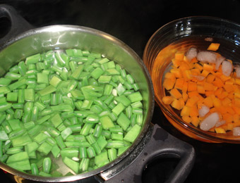 Una vez limpias las verduras, las cortamos en cuadraditos pequeños (excepto los guisantes), y las vamos cociendo todas por separado, en el mismo cazo con agua sazonada con un poco de sal, y un chorrito de aceite. Las sacaremos cuando estén cocidas, a un bol con agua salada con hielo, para cortar la cocción , queden tersas y guarden su color (foto 1ª). Hay que darle el tiempo necesario a cada una, de manera que queden justo hechas “al dente”, que tengan textura al morder. El agua de cocción, lo emplearemos para mojar el arroz, ya que en él quedará todo el sabor de las verduras. |
