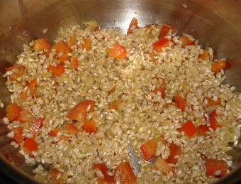 En una sartén con un chorrito de aceite, fondeamos la cebolleta o chalota picada, junto el ajo y el pimiento rojo (cortado del mismo tamaño que las verduras cocidas). Cuando estén blandas, sin que cojan color, añadimos el arroz, y rehogamos hasta que éste empiece a bailar (foto 2ª). Agregamos el vino blanco y lo dejamos reducir hasta que evapore el alcohol. Vamos incorporando el agua de la cocción de las verduras, poco a poco, según se nos vaya éste consumiendo. Ponemos a punto de sazonamiento. Removemos constantemente para que el arroz suelte el almidón. Cuando falten unos dos minutos para que esté cocinado (necesitara unos 20 minutos), añadimos las verduritas reservadas, y mezclamos con cuidado de no romperlas. Apartamos del fuego, y dejamos que el arroz repose tapado con un paño, unos 3 minutos antes de servir (foto 3ª).