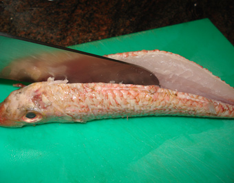 Por otro lado, escamamos los salmonetes, les sacamos los lomos con un cuchillo (foto 2ª) y los desespinamos con ayuda de unas pinzas. Reservamos los lomos. Las espinas centrales y las cabezas sin los ojos (bien limpias) las ponemos en el agua de cocción de los caracolillos, junto con alguna verdura (el blanco de un puerro, una zanahoria, un ajo, un ramillete de perejil), y unas hebras de azafrán y dejamos que cueza a fuego lento unos 15 minutos. Apagamos, tapamos y dejamos enfriar, que infusione, para obtener un buen fumet.