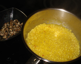 Para elaborar el risotto, en una cazuela baja, con un poco de aceite, rehogamos las chalotas picadas, durante unos minutos sin que nos cojan color. Salpimentamos, añadimos el arroz, y lo tostamos durante 2 minutos, hasta que se vuelva transparente. Incorporar el azafrán, y vertemos con vino blanco y dejamos que se evapore. A continuación vamos mojando el arroz con el fumet caliente, poco a poco, removiendo continuamente con una cuchara de madera. Según vaya absorbiendo el caldo el arroz (foto 3ª), incorporaremos más caldo. Coceremos primero a fuego fuerte durante 3 minutos y luego bajaremos el fuego. En total lo tendremos cociendo sin dejar de remover, unos 16 a 17 minutos. |