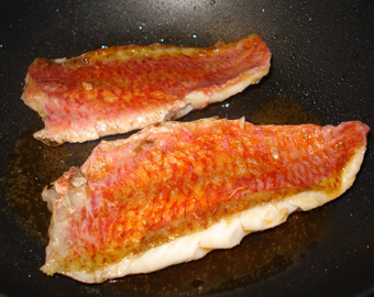 Una vez listo el arroz, marcamos los lomos de salmonete por el lado de la piel en una sartén antiadherente, con una cucharada del aceite, hasta que adquiera un poco de color. Les damos la vuelta (foto 4ª) y los dejamos un minuto más. Retiramos.
