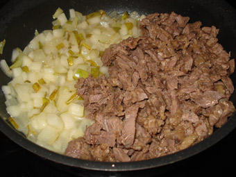 Por otra parte descorazonamos las peras y las picamos con la piel, en cuadraditos pequeños. En una sartén con un poco de mantequilla, a fuego suave, rehogamos las peras. Una vez comiencen a ablandarse, incorporamos las carrilleras picadas (foto 2ª). Mezclamos, cocinamos un par de minutos y dejamos enfriar.