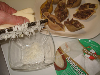 Una vez templadas, rellenamos las caracolas con las carrilleras, y las disponemos en una fuente o directamente en los platos. Espolvoreamos por encima con un queso suave recién rallado (foto 3ª).Es conveniente que sea un queso cremoso con poco sabor, para que no le reste protagonismo a nuestro relleno. Yo he elegido un queso italiano, el Provolone. Gratinamos hasta que el queso se funda y se dore un poco.