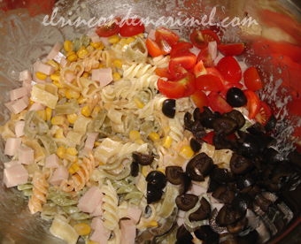 Preparamos los demás ingredientes. Lavamos los tomates y los cortamos en cuartos. Cortamos el jamón cocido en cuadraditos. Escurrimos los granos de maíz. Las aceitunas las cortamos en rodajas. Podemos mezclar estos ingredientes con la pasta (foto 4ª), o disponerlos sobre la pasta a la hora de emplatar para que resalten más los colores. Nosotros los hemos mezclado.