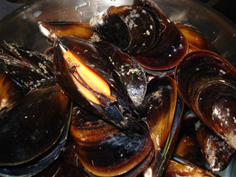 En una cazuela amplia con un poco de aceite, sofreímos el ajo, el trozo de guindilla y la cebolleta picada. Antes de que cojan color, introducimos los mejillones bien limpios, junto con el vino blanco y el agua. Hervimos a fuego fuerte (foto 1ª). En cuanto se abran los mejillones, los retiramos a una fuente.