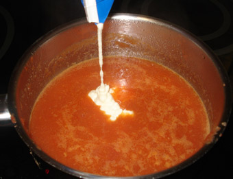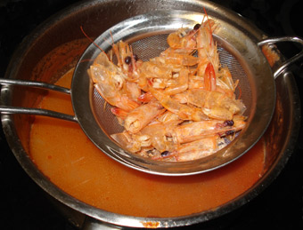 Pasado este tiempo, colamos sobre un cazo, aplastando bien las cabezas, para sacarle todo su jugo (foto 2ª). Incorporamos la salsa de tomate y la nata líquida (foto 3ª), rectificamos el punto de sal, bajamos el fuego al mínimo, y cocemos hasta que nos quede una salsa cremosa y ligada. |