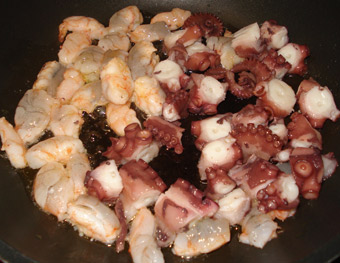 Salteamos los trozos de pulpo y langostino sazonados, en una sartén a fuego fuerte, dejando que se doren estos últimos, pero que queden jugosos por dentro (foto 4ª).