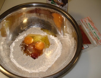 Primeramente preparamos la masa para elaborar los raviolis (“plegados” en italiano). Para ello ponemos en un bol la harina, hacemos un hueco en medio y disponemos en él los demás ingredientes (foto 1ª). Amasamos. Nos costará un poco. Una vez amasada, hacemos una bola con la masa y la dejamos reposar tapada con papel film una media hora en la nevera.