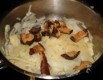 Para la salsa rehogamos en un cazo la cebolleta, a fuego suave durante unos 6 minutos, hasta que se vuelva transparente. Añadimos las setas y los brotes de bambú y rehogamos otros 5 minutos más (foto 3ª). Sazonamos. Cubrimos de caldo de carne o agua y dejamos cocer unos 20 minutos. Añadimos la nata y dejamos cocer 10 minutos más. Trituramos, colamos y ponemos a punto de sazonamiento. Nos tiene que quedar una salsa ligerita.
