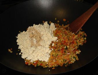 Mientras reposa, hacemos el relleno. Picamos la verdura muy pequeñita y la rehogamos a fuego medio en el wok con un poco de aceite de oliva y un poco de aceite de sésamo. Sazonamos con un poco de sal y una pizca de jengibre rallado. Dejamos cocinar de 3 a 5 minutos sin que nos coja mucho color. Incorporamos el tofu desmigado con un tenedor junto con un chorrito de soja (foto 2ª).