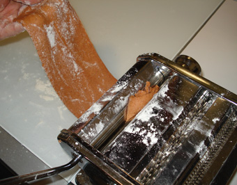 Amasamos con el rodillo de la máquina (foto 4ª), dándole varias vueltas a la rosca de más a menos abertura, hasta que nos quede la masa muy delgada. Espolvoreamos la masa con harina cada vez que la metemos de nuevo al rodillo, para que no se nos pegue. (También podemos hacerlo con paciencia con ayuda de un rodillo).