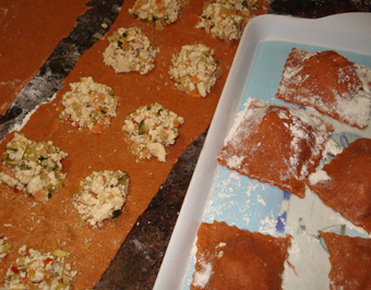 Ponemos la otra lámina encima, y apretamos los bordes de cada porción con la ayuda de la yema del dedo. Cortamos con ayuda de un cuchillo los raviolis, o mejor con una rueda dentada que le dará a los bordes el aspecto típico del ravioli. Los ponemos en una bandeja enharinada y los espolvoreamos de harina para que no se sequen, ni se peguen entre sí (foto 5ª).