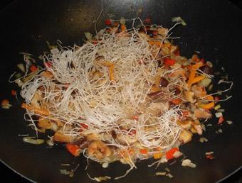 En un wok con un poco de aceite de girasol, salteamos las setas, el pimiento rojo y la cebolleta cortadas en trozos pequeños. Añadimos la zanahoria pelada y rallada. Dejamos que se haga a fuego fuerte un par de minutos. Añadimos la col cocida y escurrida, los fideos cortados, un poco de soja y el caldo de cocción de las cabezas y las pieles de gambas (foto 1ª). Dejamos unos 3 minutos que se hagan los fideos y chupen el caldo.