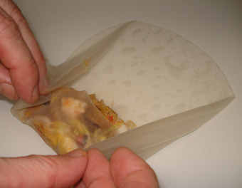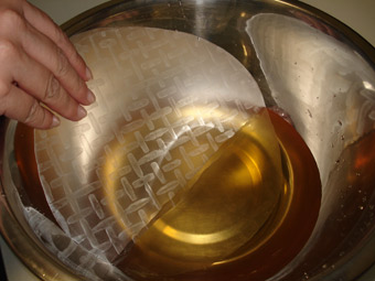 En un bol grande mezclamos una cucharada de soja, otra de azúcar moreno y medio litro de agua caliente. Sumergimos en él las obleas de arroz (foto 2ª). Una vez que éstas se vuelvan moldeables, las colocamos sobre una mesa, y las secamos con papel absorbente. Colocamos un poco de relleno frío encima de una oblea, doblamos las esquinas hacia adentro (foto 3ª) y enrollamos. Repetimos el proceso hasta acabar el relleno. |