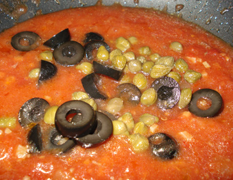 Para elaborar la salsa puttanesca, ponemos una sartén al fuego (bajo) con un chorrito de aceite y el ajo finamente picado. Dejamos unos segundos y cuando empiece a bailar añadimos la mitad de las anchoas previamente triturados en un mortero (foto 1ª). Yo dejo la mitad para decorar, porque si no le da demasiada potencia al guiso. Removemos, vertemos la pulpa de los tomates y la cayena. Subimos el fuego y dejamos cocinar unos 5 minutos. Por último añadimos las aceitunas cortadas en rodajas, las alcaparras y un poco de orégano (foto 2ª). Dejamos un par de minutos más, retiramos la cayena, y ponemos a punto de sal y de pimienta (cuidado porque los encurtidos y las anchoas salan mucho el guiso).