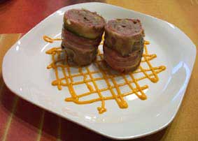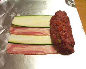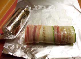 de aceite. Encima distribuimos una loncha de bacon, otra de calabacín